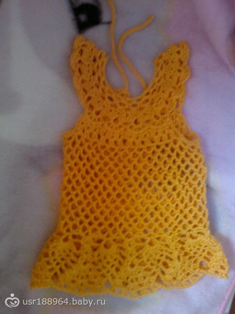 фото ужасное, но другое пока не могу сделать. Эта маечка на рост 74-80 см, можно внизу довязать еще ряд для девочки побольше, можно навязать еще 3-4 ряда и получится сарафан. Есть такого же качества зеленая нить то есть будет двухцветным.Скажите а вы можете связать вот такие цветочки как на фото??