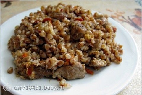 2.Гречку промыть, выбрать мусор, прожарить на сковороде, выложить к мясу.