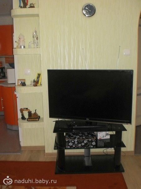 По началу хотели телевизор просто на столик ставить и что бы рядом стена свободная была, но потом подумали, что тогда вещи не куда класть совсем. И в результате у нас все стены в комнате это шкафы. Зато для всего есть свое место. Телик так стоит напротив дивана