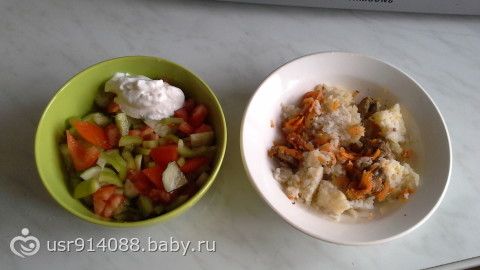 Обед салат из помидора, огурцов, перца болгарского со сметаной и плов