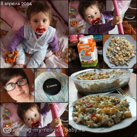 Сегодня у нас вообще кошмар творится. Дочка целый день плачет, с рук не слезает, да и на руках тоже ноет. Недавно дала ей 2,5 мл Нурофена, вроде ей полегче стало, всё же думаю, что зубы лезут. Нам уже 8 месяцев почти, а у нас ни одного зуба! Но верхние уже почти видно, всё-таки кажется, что они первые и полезут. Сейчас Маруся сидит спокойно, наверное, лекарство подействовало, больше не хнычет. Надеюсь, сегодня все нормально поспят. Так, а я продолжаю худеть. Сегодня 9й день моей диеты!) На сегодня было 1100 ккал, но, по-моему, я немного переела. Думаю, не страшно, завтра сделаю разгруз на 200 гр шоколада.) Вот как наш день проходил сегодня, ничего особенного. Приготовила салат по одному рецепту из группы, где все девчонки худеют. Получился ничего такой, главная суть в том, что заправляла я его ни чем иным, как зернистым творогом.) Вкуснотища! И для фигуры не вредно, если совсем уж не переборщить)))
