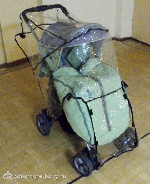 - — В комплект входит капюшон-козырек от солнца, накидка на ножки, дождевик и корзина для покупок;