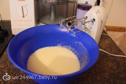 - Яйца взбиваем с сахаром до получения густой и пушистой массы. Лучше это делать при помощи миксера.