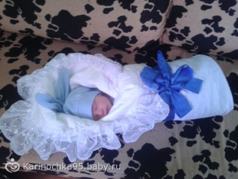 старшего выписывали в красивом песочнике, шапоске и носочках, для удобства папы, сын лежал на трикотажном пледе...