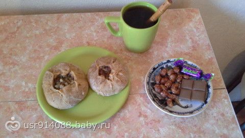Завтрак 2 курника, кофе с сахаром, арахис в сахаре тёмном, шоколад и конфету не ела
