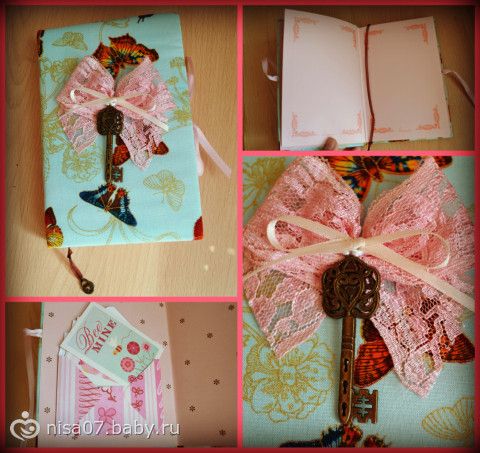 вот еще один блокнотик) Тут я взяла за основу готовый и переделала его обложку) Формат А6) Бантик может быть многие подумают, что не в тему, НО я объясню для чего я его прикрепила) Во первых он на булавочке, т.е. это даже брошка)) во вторых он сделан из кружева, которое мне оставляла после себя наша прабабушка) и к сожалению сестренки еще не было когда бабушка умерла, и мне захотелось вот так вот ей передать такую частичку от нее)