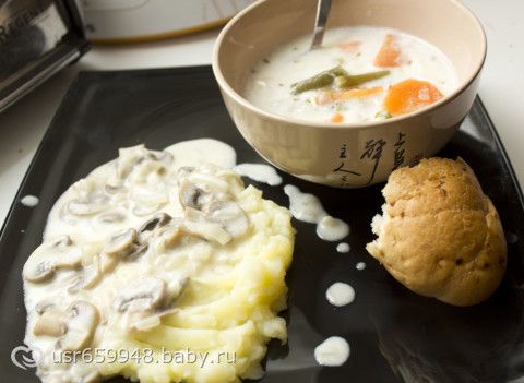 На второе: шампиньоны в сливках с картофельным пюре. Ссылка на рецепт: мой второй блог посвященный кулинарии