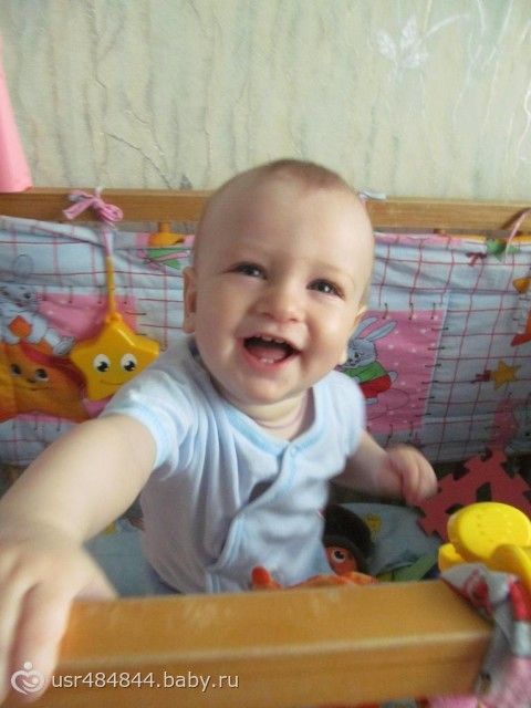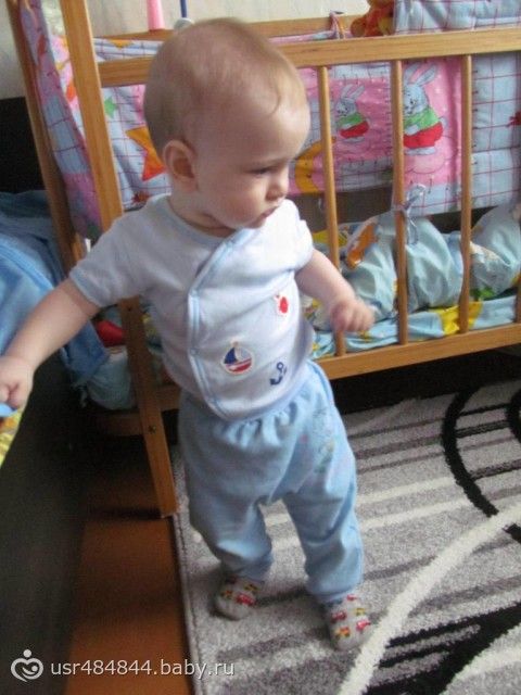 Тимоха мой встаёт у опоры, ходит у опоры, за одну ручку ходит хорошо, отпускаю его когда, так стоит сам секунд 5) На улице когда гуляем, так как только увидит детей, сразу бежит к ним) общительный)
