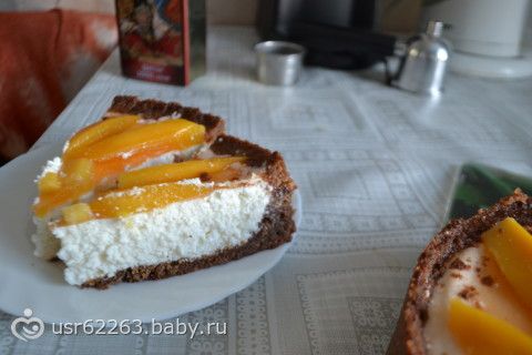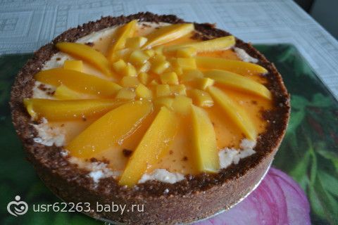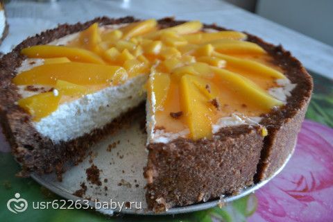 Рецепт писать не буду, тк это полет фантазии. Это не чизкейк. Начинка — взбитые сливки с творогом с добавлением желатина. В основе печенье и шоколадные сухие завтраки. Сверху манго консервированное, и должен был быть 3см сой желе, но оно просочилось сквозь разъемную форму. Что бы этого не случилось, желе нужно заливать постепенно. Когда тонкий слой застынет, остальное не протечет.