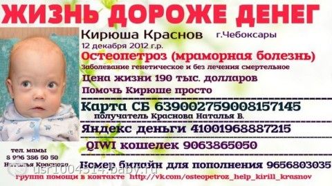 Начиная с самого рождения Кирюшу губит болезнь! он плохо дышит, потерял зрение, не развивается, с каждым днем увеличивается селезенка и печень и за за этого ему тяжело дышать. Малыш постоянно терпит сильные боли.единственный шанс его спасти Трансплантация костного мозга.В России уже почти год операцию постоянно откладывают.У детей с таким диагнозом на счету каждый день, болезнь очень быстро прогрессирует, и чем раньше сделать ТКМ тем больше шансов у ребенка выжить.Родители были вынуждены обратиться в клинику Израиля, им выставили счет 8 037 697 рублей. Родители обращаются во все возможные фонды: фонд Хабенского, Фонд Гольфстрим, Фонд Счастливый Мир, Настенька, Добрые сердца, Предание… этот список можно продолжать долго, но к сожалению пока везде отказ… родители будут продолжать и дальше поиск фондов которые смогут им помочь.сейчас пока собрали помимо сбора еще на поиск донора, мама ведет переговоры с клиникой, о дальнейших действиях.Наталья Краснова (мама Кирилла) находиться в отчаянии, потому что жизни ее ребенка назначили цену, а где найти такие деньги она просто не представляет. Возможно вы сможете помочь в их беде.Он такой мальчик чудесный, он очень хочет жить!!!!