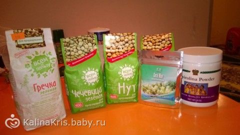 Вчера попала в магазин Здоровье, и коралловый клуб вот, что купила. Гречку зеленую, нут и чечевицу зеленую для проращивания, порошок Спирулины и коралл для воды.