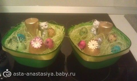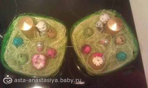 Это тоже не то чтобы подарок, просто яички оформила так, а вышло совсем не дорого, чашка 60рх2, сетка 150р-1м, хватило половины, лента 10р-1м, свечки по 40, кошечки по 40 и все в районе 200р за подарок вышло)