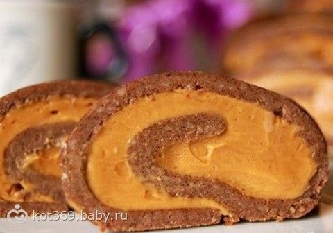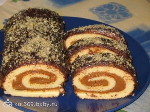Выпеченный пласт разрежьте пополам. Каждую часть быстро смажьте сгущенным молоком, сверните рулетом и охладите. При подаче нарежьте рулеты ломтиками.