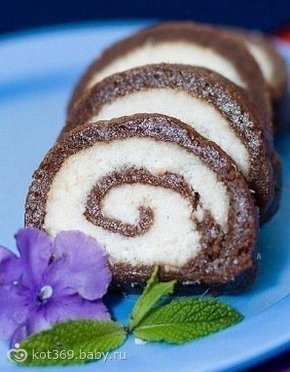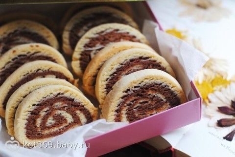Оба кусочка теста раскатать в тонкий пласт и наложить один на другой. Скатать рулет и нарезать на кружочки по сантиметру.