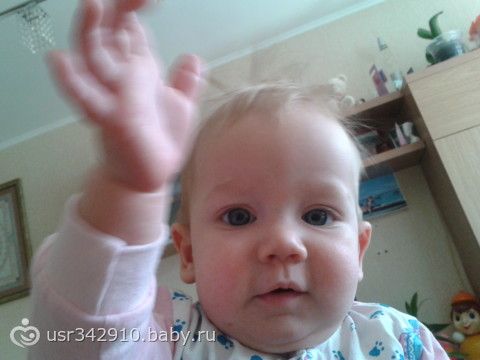 вот и еще один месяц позади, ребенок растет не по дням, а по часам. Ползает, смешно шлепая ладошками, доползает до табуретки, до стола с аквариумом, встает и смотрит на рыбок, попутно облизывая стол. Вообще, большой любитель стучать чем нибудь о какую либо поверхность, если в руках ничего нет, принимается лупить ладошками. Любит шлепать по клавиатуре, облизывать проводаЛюбит ладушки, сам не хлопает, но по подставленной ладони аж двумя руками.