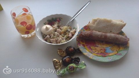 Завтрак оливье, сок, сосиска в беконе с сыром, хлеб и конфеты