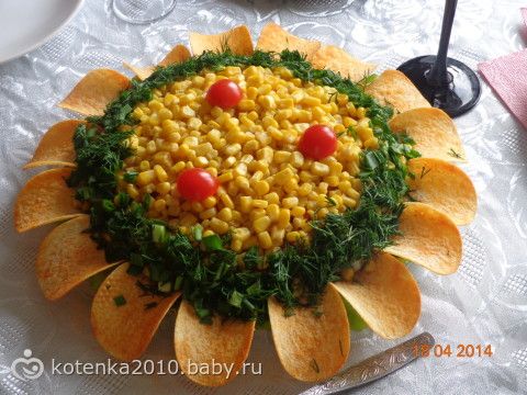 Еще вкусный с ветчиной. 300 грамм ветчины тоненькой соломкой, 1 банка кукурузы, лук+морковь обжаренные и 5-6 омлетиков-блинчиков соломкой ( на 1 омлетик 1 яйцо, соль и столовую ложку молока, взбить вилкой, обжарить как блин). майонез, можно петрушку