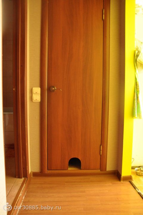 С этой дверью у нас очень давняя история. Стоит упомянуть, что дверь эта не простая, а от туалета, то есть стратегически важная и часто используемая. Началось все с того, что в нашем доме появился кот. До этого момента дверь мирно жила и закрывалась до щелчка всегда, когда приходила в движение, но вот беда, кот дверь открывать не умеет, пришлось найти подходящую бусину и сделать дверь не закрывающейся до конца. Тогда -то и начались приключения. Сперва все шло хорошо, не считая удивленных гостей, а вот, когда сыночек начал ходить, началось! Парню ужасно хотелось добраться до загадочной комнатки, откуда его постоянно выпроваживали, так хотелось, что мама почти перестала испытывать одиночество в этом некогда уединенном месте, сына не давал заскучать! Короче, пришло время заканчивать с этими днями открытых дверей. Давно я так не радовалась своим придумкам, всего 15 минут эксплуатации грубой мужской силы и, вуаля, модифицированная супер-пупер кошачья дверь готова! А вот, собственно, и она!