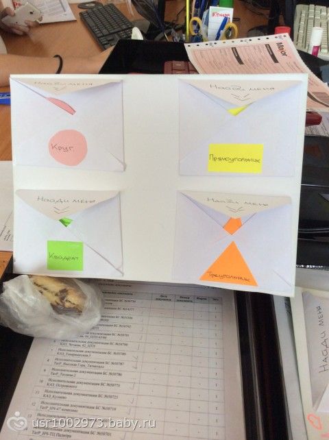 Вот что еще смастерила. не судите строго. руки не из того места но смысл такой. Там 4 конверта и в них фигуры по цветам. А на конверте те же фигуры. необходимо ребенку показать где какая фигура лежит.Вытащить из конверта фигуры и перемешать их и вместе сложить обратно. Опять память и цвета задействованы и логика конечно.