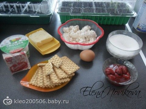 Творог — 500гр., печенье любое песочное — 250-350гр.,сливочное масло — 100гр., яйцо — 1шт., сметана — 100гр., сахар — 150гр., клубника — 100-150гр., ванилин — 1/2 пакетика (пакетик в 1 грамм), цедра одного лимона.