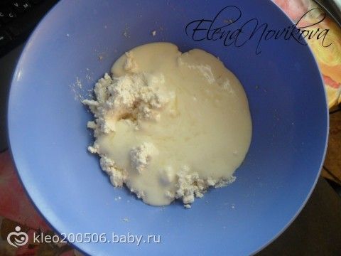 Теперь яйца с сахаром и сметаной перекладываем к творогу и взбиваем.