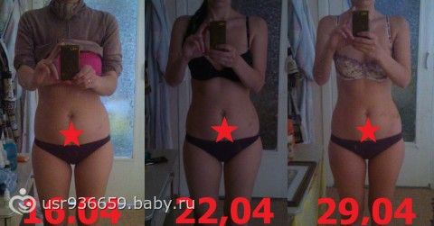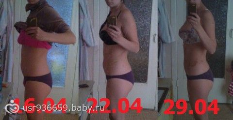 Главное — объемы меня устраивают — при моем росте выгляжу очень даже стройно. Влезаю во всю добеременную одежду, а вещи с прошлого лета некоторые велики. Поэтому с диеты я слезаю и перехожу просто на правильное питание. А т.к. кожа на животе не совсем упругая, да и бока еще б чуток убрать, продолжаю качать пресс, делать различные упражнения, крутить садистский обруч и обертываться (оказывается это так приятно ). еще приседаю и делаю махи ногами.
