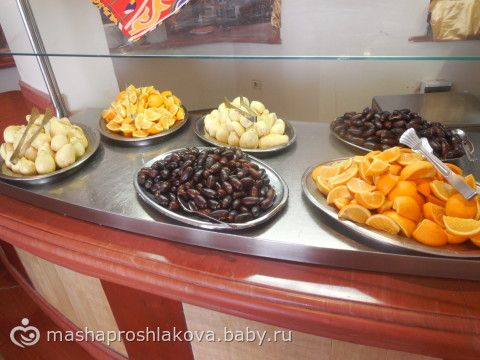 2 Питание на первый взгляд разнообразное но когда начинаешь выбирать ничего и не охота. Давали раза два очень вкусный гуляш, картошку пюре. Мяса очень маленький выбор, а вернее не было выбора. Сладостей был большой выбор.Фруктов мало, финики, гуава, и апельсины иногда давали маленькие бананы.Картошка дольками была тушенная в каком то бульоне но она сырая. Есть два ресторана Восточный и Итальянский.В итальянском ресторане из всего что давали кушать съедобная была только пицца.В восточном ресторане из съедобного только сок. еду мало фоткала