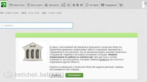 В связи с неспокойной обстановкой в Донецкой и Луганской областях, ПриватБанк временно ограничивает работу отделений, банкоматов и терминалов в этих регионах. Мы не можем рисковать жизнями клиентов и сотрудников. Надеемся на скорое улучшение ситуации. Никаких ограничений по работе со счетами нет. Для доступа к счетам, пожалуйста, воспользуйтесь Интернет-банком или посетите отделение в другой области.