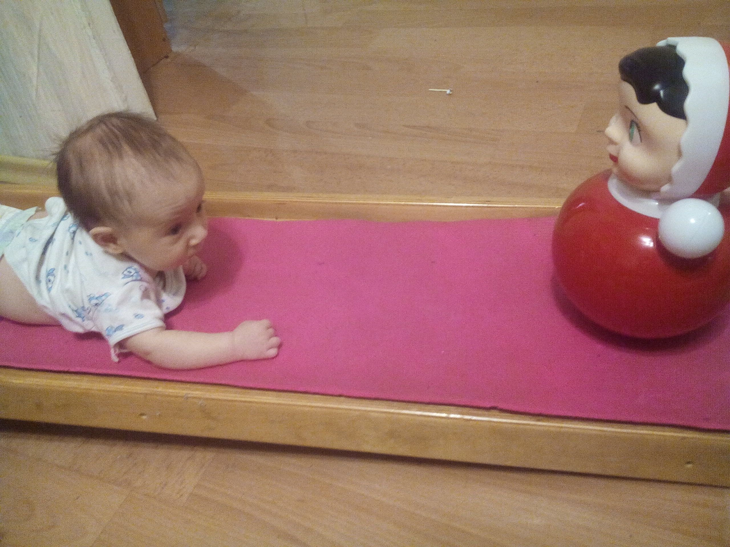 положила сейчас Машуню так, что она ногой упирается в дугу. Она ею дрыгает, игрушки соответственно раскачиваются, так столько удивления и радости! гулит, чего-то говорит этим игрушкам, рассматривает так внимательно! а у меня на руках только что капризничала. Растет девочка!