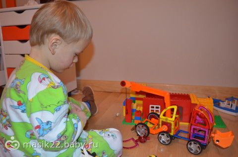Я всегда и всем говорю, что преждем чем требовать от ребенка самостоятельности, что бы играл сам и т.д. Нужно его этому научить, сесть и пару раз поиграть вместе, показать, как строить конструктор, складывать пазлы. А то все хотят, что бы ребенок не мешал, но усилий приложенных ноль со своей стороны. Тогда выход один-врубить тупые мульты на целый день. Наш сейчас подесел на магнитный конструктор, очень советую. Супер вещь. Вот такие машины обьемные делает сам.