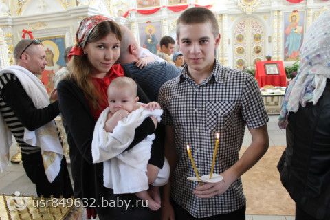 3 мая 2014 года мы покрестили нашего кроху. В этот день крестили 15 деток, в общем народу было много))) Сыночек большой умничка, все стерпел героически, мой мужчина!)))) Плакали детки громко, много и постоянно, Клим плакал всего один раз, когда наливали воду на голову, остальное время он был занят — палец сосал аж причмокивал)))) В общем теперь у моего роднульки есть еще родители)))