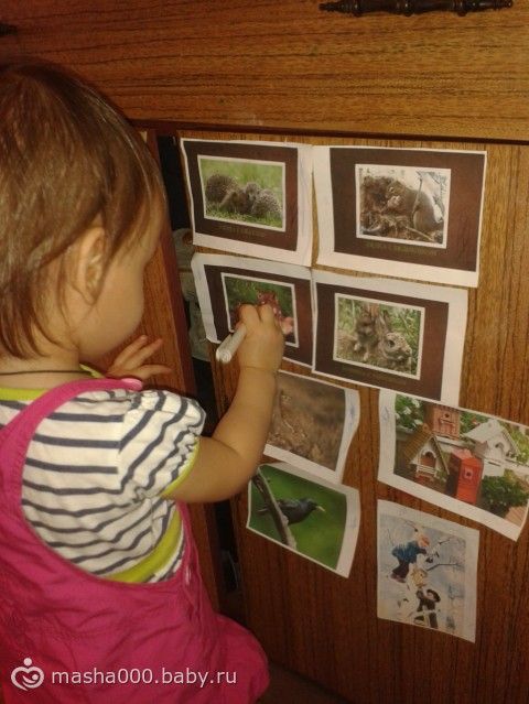 Развешали весенние картинки зверят с потомством!!! Она их уже все называет, в данном случае еще и подписывает-типо… а сама проговаривает зверька!!!!
