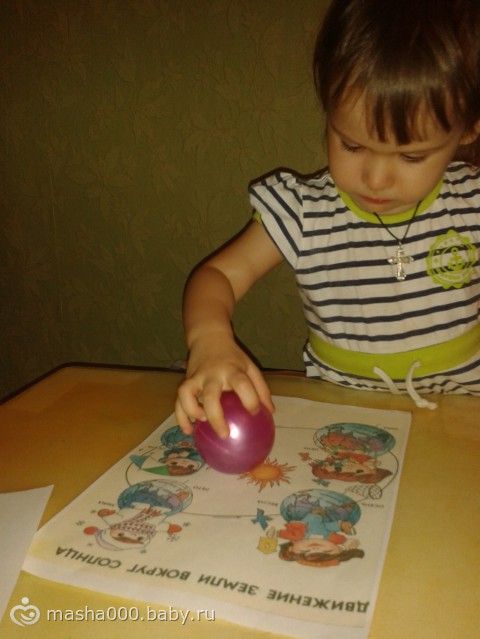 катали планету вокруг солнца!!! правда мне кажется она не поняла зачем, но картинки посмотрела и поназывала времена года!!!!!