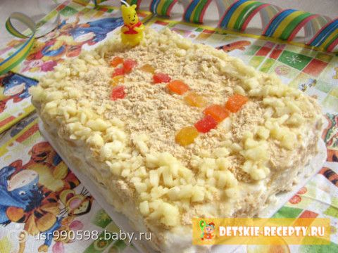 В качестве теста — любое детское печенье (400 гр). Вместо крема – творог (250 гр.), взбитый со сметаной(150 гр.) и сахаром (0,5 стакана). Выкладываем смоченные в молоке печенье на блюдо одним слоем, сверху промазываем творогом. И так несколько слоев. Между слоями и для украшения можно добавить фрукты, например бананы. Сверху торт украшаем крошкой от печенья, мелко порезанными яблоками и цукатами. При желании ставим свечку. Такой тортик подойдет как для девочки, так и для мальчика на 1 год.