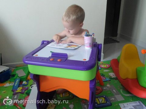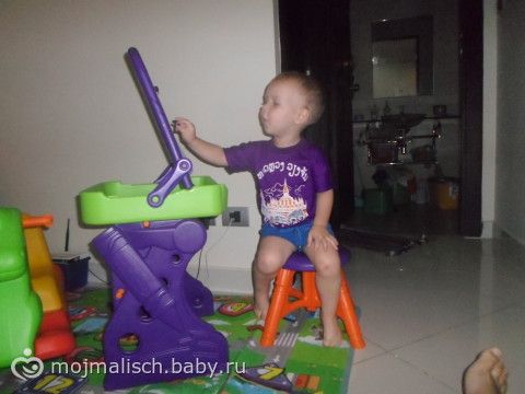 Ну вот, моему сыночку уже через пару месяцев будет 3 года! Активно играем с доской — показываем буквы и цифры (на днях ждем с туристами русский алфавит). Сам рисует и раскарашивает картинки. Пишет букву А, Л, У.