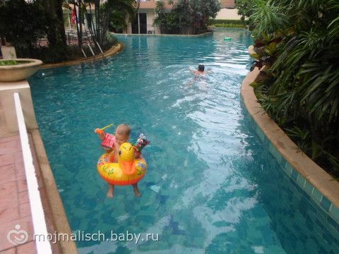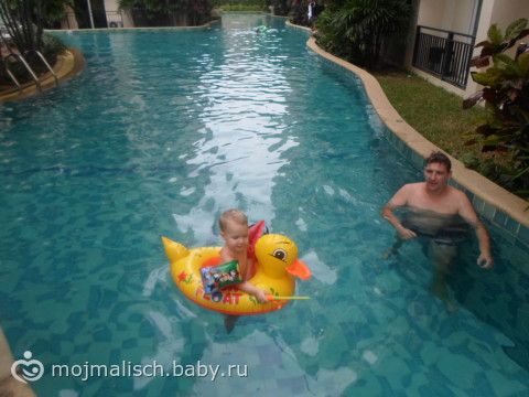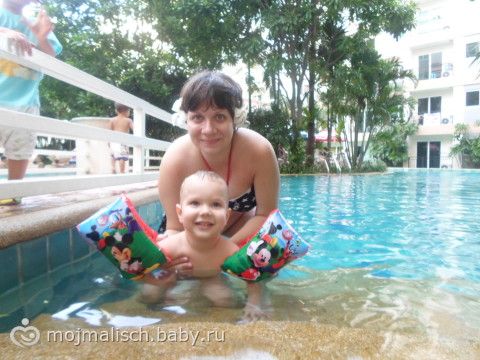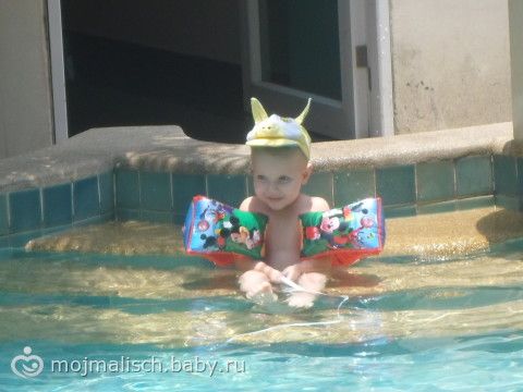 Ходим каждый день в бассеин. Сейчас берем с собой лодку утку (как сын называет «ока ука») Он в ней некоторое время сидит, играет с удочкой и рыбками, пока мы плаваем. Потом сам плавает с рукавами. Без рукавов недавно только начали учить его плавать. Но он немного побаивается.