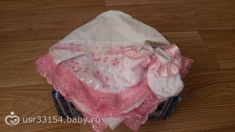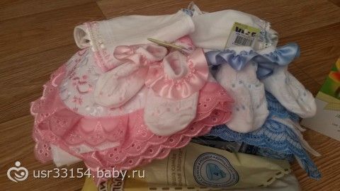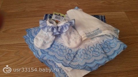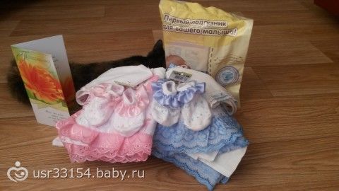 , так приятно. в них входит по чепчику, уголку и носочки, все просто супер. Мне очень понравилось, долго все разглядывала, даже всплакнула чуть-чуть. Ну конечно не обошлось без моей любопытной кошки, все время заглядывала в посылку и мешала.