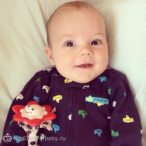 В этом месяце многое у нас было в первый раз. Первое путешествие в Москву. Первое знакомство с таким количеством людей. За этот месяц научились уверенно переворачиваться со спины на живот. И теперь это его любимая поза. Нигде не возможно положить на спину. Тут же оказывается на животе. Даже в шезлонге пытается перевернуться. В развивающем коврике теперь тоже исключительно на животе лежим. Пытается ползти, но пока с трудом получается преодолеть пару сантиметров. Но теоретически видно, что он понимает, что нужно делать. В этом месяце у нас был небольшой лактокриз (как я думаю), но мы его пережили и продолжаем кушать мамино молочко. Правда, теперь во время кормления все внимание должно быть сынуле. Если папа заходит в комнату, то сразу отвлекается на него.