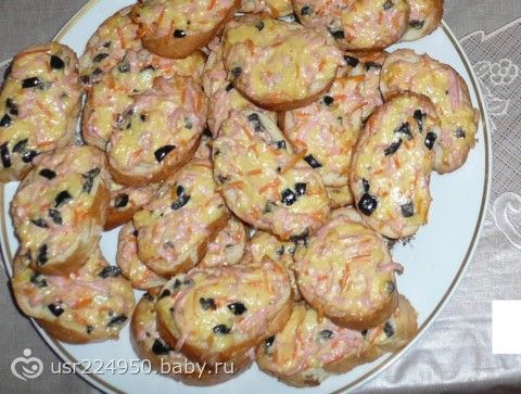 корейская морковь, тертая копченая колбаса, сыр тертый, майонез. Все перемешать, намазать на батон и запечь в духовке