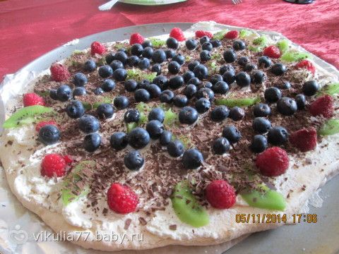 У меня получился более плоский, потому что ожидалось много гостей, вот я его и растянула, чтоб всем хватило)))) Сливки взбивала без сахара, безе и так сладкое.Фрукты для украшения любые, главное, что не пускали сок.Но так как рецепт австралийский, практически обязательно должно присутствовать киви)))Я что нашла в холодильнике, то и накидала))Торт легкий, быстро и легко готовится)))
