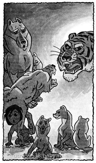 Рёв тигра наполнил пещеру громовыми раскатами. Мать Волчица, стряхнув с себя волчат, прыгнула вперёд, и её глаза, похожие во мраке на две зелёные луны, встретились с горящими глазами Шер-Хана.