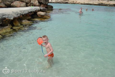 Пляж у отеля песчаный, небольшая мелкая бухточка, водичка теплая, детишкам раздолье. Подальше — вода прохладная, но мы купались.