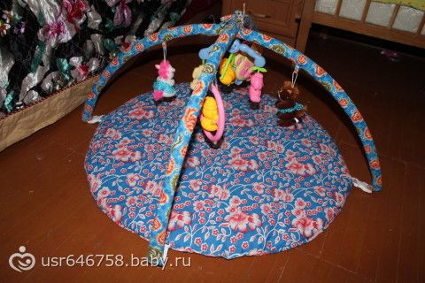 только без шишечек. Но можно и из обычного более дешевого. Большой плюс разбирающгося в том, что им потом можно будет продолжать пользоваться по назначению)) Да и при хранении или перевозке такой коврик будет занимать намного меньше места. А «чехол» для обруча шила по принципу рукава для одежды, только более узкого и длинного. На концах этих «рукавов» пришиты завязки, такие же завязки пришиты и на коврике на одинаковом расстоянии друг от друга. А место где перекрещиваются дуги перевязала. И так эти дуги никуда не денутся, но даже если их малыш уронит (что мало вероятно-это Вы увидите когда вся конструкция будет полностью собрана и закреплена) эти дуги ему не причинят вреда, тк они оч легкие.Вот как-то так))Если еще что-то заинтересует-спрашивайте))какой суперский! Я тоже сама делала, но у меня попроще получился