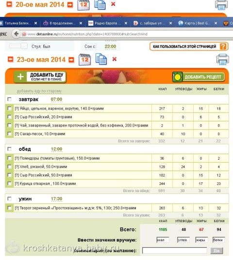 Это на сегодня у меня. В основном я кушаю творог 5% или обезжиренный, отварная курица, рыба, вареные яйца, сыр, иногда черный хлеб, овощи все кушаю, из фруктов только грейпфруты, яблоки и ананасы(свежие), клубнику. Вообще не пью кофе, только чай. Сахар в чай добавляю только потому что организму нужна глюкоза.