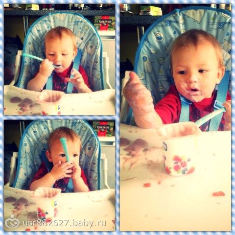 Мой зайчик первый раз кушал без моей помощи. В рот ему конечно мало попало. Но сам процесс ему понравился. Он больше руками пытался есть чем ложкой :) потом принимали ванну чтобы отмыться.