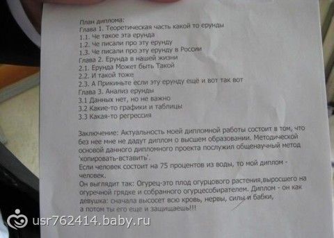 Универсальный план дипломной работы)))) 23 мая 2014 19:46 Комментарии Пожалуйста, будьте вежливы и доброжелательны к другим мамам и соблюдайте правила сообщества ПожаловатьсяСкопировать ссылку Алечкин Сынулечкин13 лет я хохотала до слез!!! сразу свой диплом вспомнила ПожаловатьсяСкопировать ссылку Наргиза Тологонова Арман13 лет Москва прикольно))) ПожаловатьсяСкопировать ссылку Наргиза Тологонова Арман13 лет Москва прикольно))) ПожаловатьсяСкопировать ссылку Наталья Стар да, да, да)))) ПожаловатьсяСкопировать ссылку Ильвира София13 летЭмиль12 лет Уфа актуально))) ПожаловатьсяСкопировать ссылку Натка-мама-Димы-и Лешеньки Дмитрий17 летАлексей13 лет Фаниполь ПожаловатьсяСкопировать ссылку Тося Мышка12 лет Москва как хорошо, что это позади!!! ПожаловатьсяСкопировать ссылку ♥£Меркантильный♥Тунеядец¥♥ Максимка13 лет Москва ПожаловатьсяСкопировать ссылку Евгения Софья12 летДима9 лет Екатеринбург вот бы диплом этого человека почитать))) ПожаловатьсяСкопировать ссылку Илона Богдан30 летДиана23 годаСофия13 лет Могилев Прикол ПожаловатьсяСкопировать ссылку Даша Домбровская Дамир12 лет Пинск Предыдущая статьяЛялечка моя несчастная...Следующая статьяГоворила мне Мама....Актуальные постымимическая асимметриячем протирать носик новорожденному от прыщиков