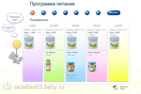 Если ваш ребенок до 5 — 6 месяцев получал исключительно грудное молоко и при этом рос и развивался нормально, то теперь настала пора начать введение в его рацион новых продуктов. В зависимости от индивидуальных особенностей ребенка, рекомендаций врача и ваших личных пожеланий это могут быть сок, пюре — фруктовое или овощное. При склонности ребенка к аллергическим реакциям в качестве первого, нового для ребенка продукта в некоторых случаях можно рекомендовать овощное пюре (с половины чайной ложки постепенно довести объем порции до 150 г). Через 2 — 3 недели после этого ребенку можно предложить очередной новый продукт. Через месяц после того, как малыш начал получать новые продукты, его меню может выглядеть примерно так: