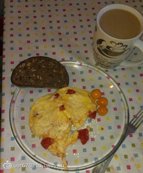 Пока она дремала в своем стульчике, я приготовила себе завтрак. Яичница с помидорами и сыром. и физалис (немножко) Ну и конечно большая кружка крепкого свежесваренного кофе с молоком.