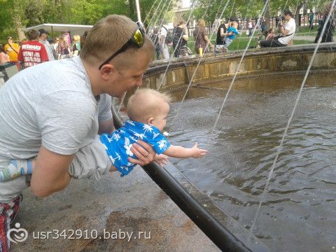 сегодня посадила малого в песочницу… он не впечатлился, потрогал песок, передернулся и руки ко мне потянул. Первая проба прошла неудачно… Попробуем еще раз попозже… А вот фонтаны нам нравятся — весь мокрый, визжит, хохочет