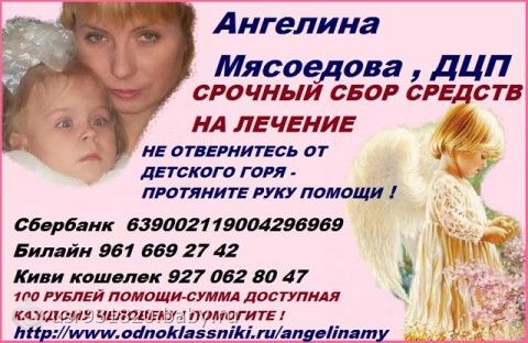 Дорогие друзья, я раньше жила обычной жизнью как все и не когда даже подумать не могла что мой ребенок будет страдать такой страшной болезнью, что вообще я столкнусь с боль и ужасом который так жестоко свалился на маю малышку. Каждый день думаешь за что её, ведь она ещё ангел не в чем не виновен, что мы должны сделать чтоб наконец от нас отступили не счастья, куда обратиться за помощью, дорогие я бы все отдала ради дочери, главное чтоб Ангелина пошла своими ножками и скажи наконец «мама». Как тяжело от всех мыслей в голове, от боли, ты ежедневно борись за дочь, стучишь во все двери и не важно что тебе уже ответят (а в голове «а вдруг помогут»). Я раньше не когда не проси у всего мира, думали сами справимся, но суммы большие выдвигают клиники они не посильны для многодетной семьи где работает один папа и ради дочери я готова на все, главная наша цель поднять Ангелину, как мне бы больно не было но я все выдержу и помогу малышке встать на свои ножке. Мы очень верим вам дорогие наши, кто то меня осудят, кто то поддержит, кто то поможет. Но у нас другого выхода нет, мы вас умоляем помогите Ангелине, поддержите нас. Как больно смотреть на малышей которые бегают, играются между собой, идут с мамой за ручку, и сразу представляешь свою малышку среди детей, слезы просто сами льются, душа болит и рвется сердце. И думаешь мы обязательно пойдем своими ножками, мы безумно любим дочь и все для неё сделаем. Дорогие не оставляйте нашу малышку, мы её не отдадим болезни поддержите нас пожалуйста. ДАЙ БОГ ВАМ ЗДОРОВЬЕ И НЕ КОГДА НЕ ПОЧУВСТВОВАТЬ ТАКУЮ БОЛЬ! одноклассникахhttps://www.odnoklassniki.ru/group/52141637107884